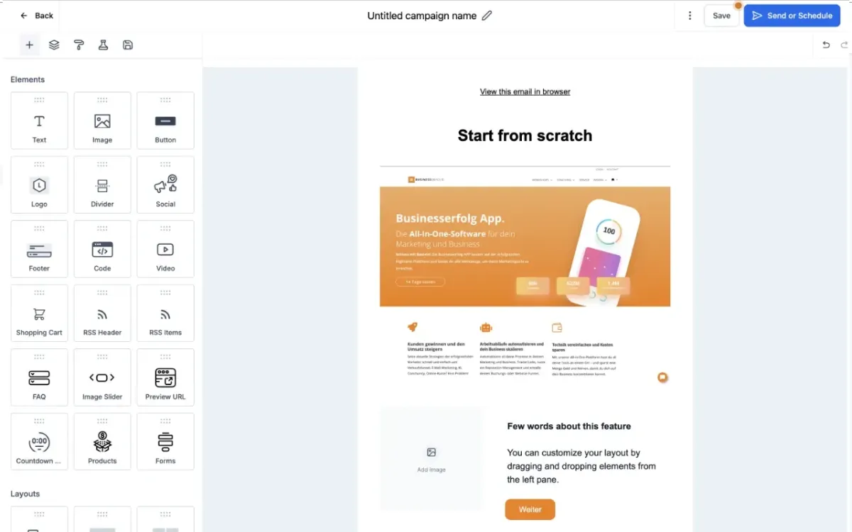 Erstelle per Drag-&-Drop ansprechende E-Mails oder nutze fertige Vorlagen.
