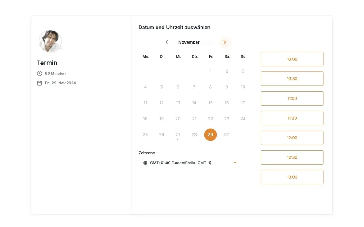 Teile deinen Buchungskalender für kostenlose Erstgespräche oder bezahlte Meetings und synchronisiere deine Termine mit Google, Microsoft, Apple.